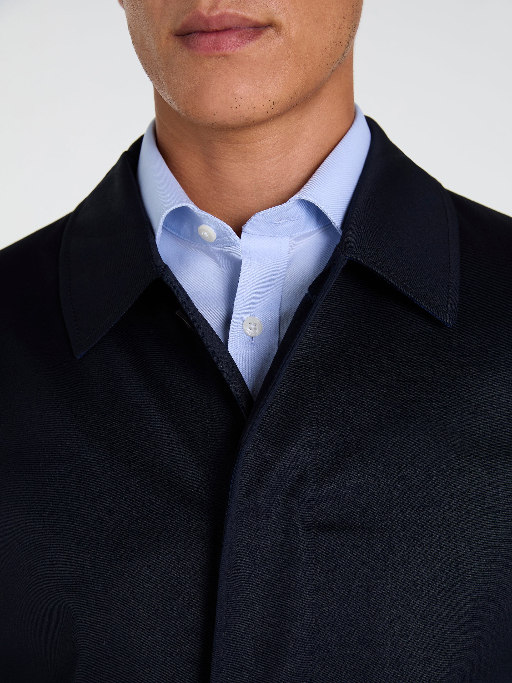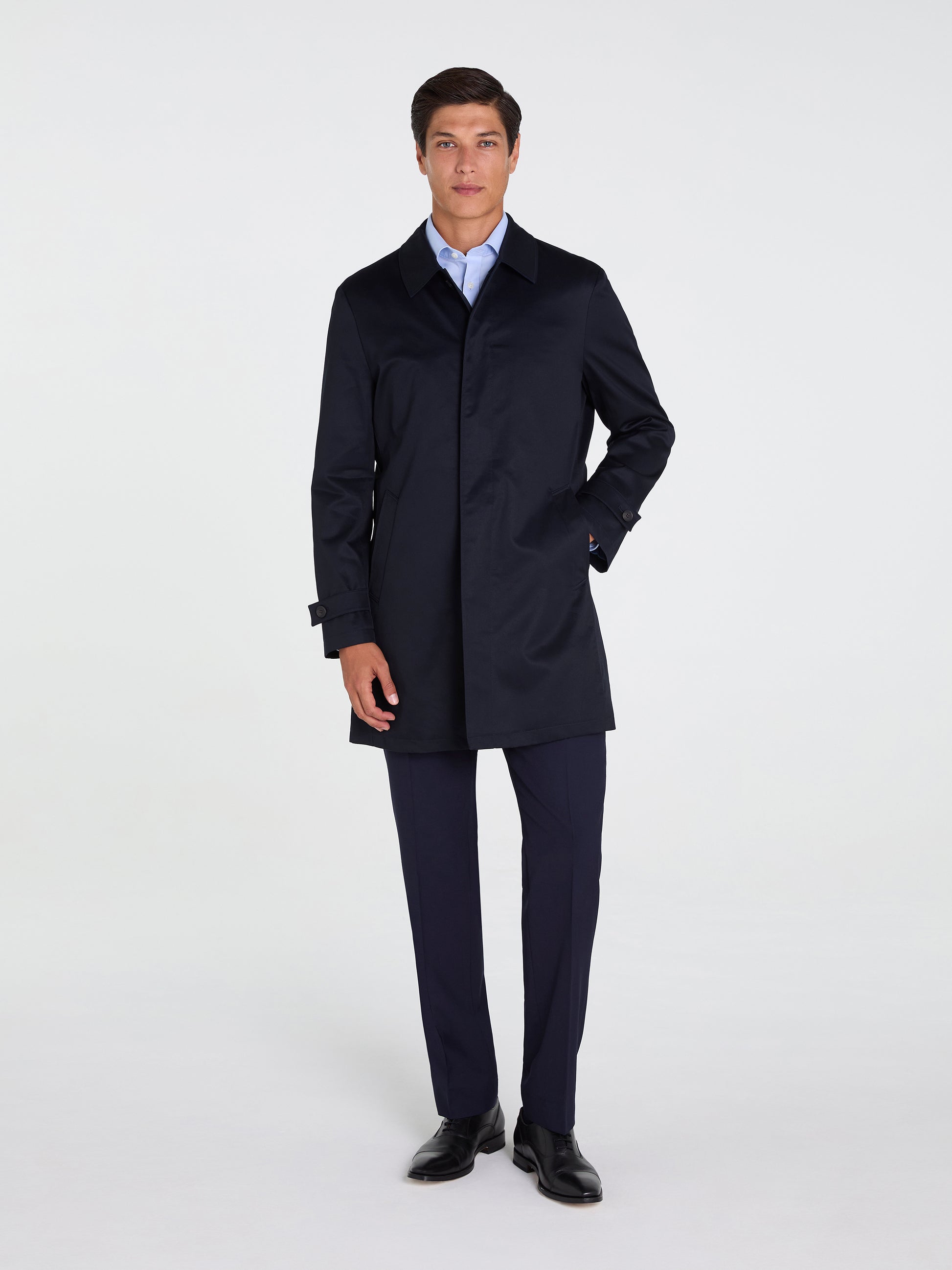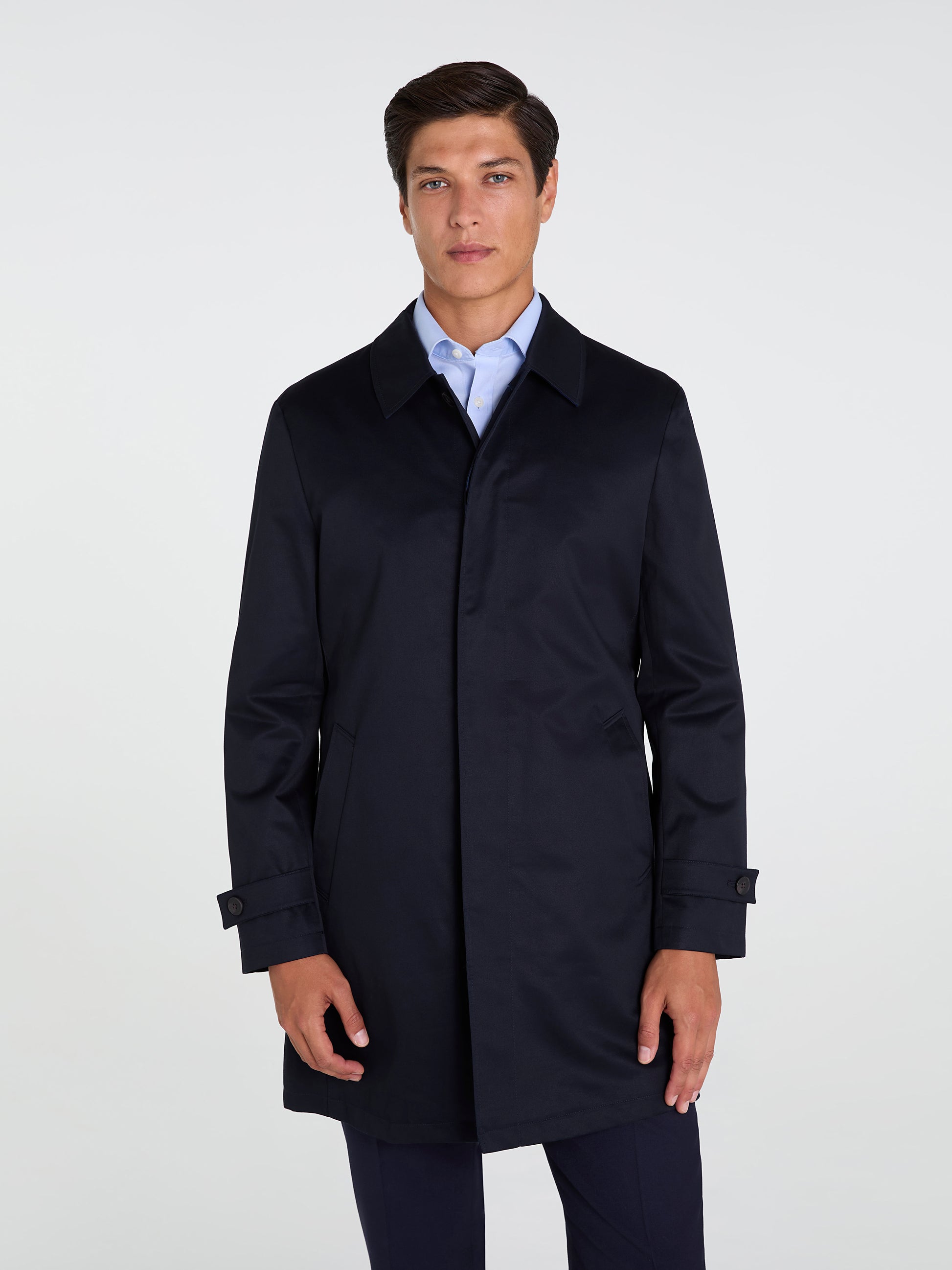 The slim fit silhouette maintains a modern look, narrowing at the waist to emphasise the male form. A placket covers the button fastening to keep it sleek and understated. The single button and semi-spread collar lend a sophisticated touch.