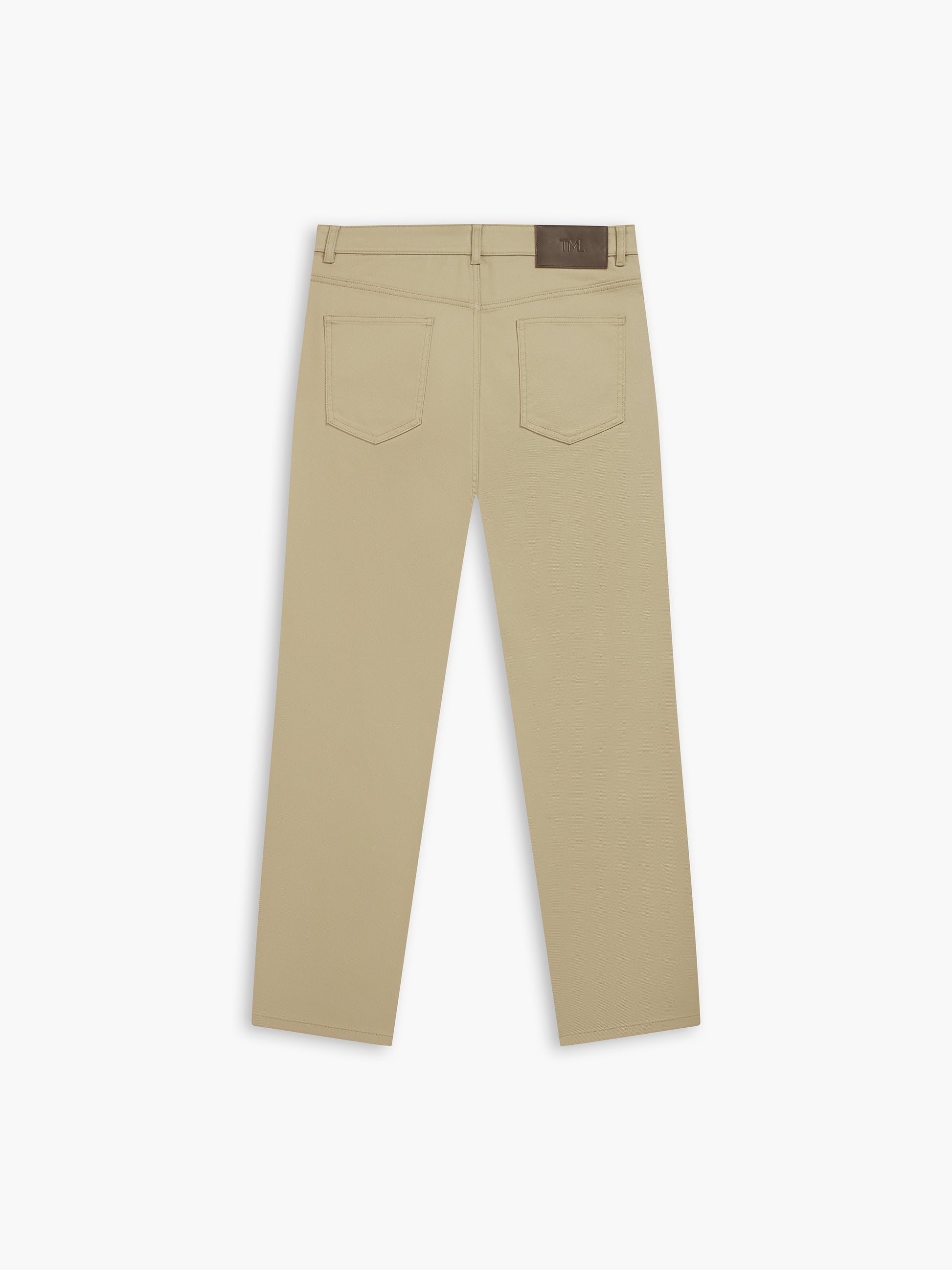 The khaki five pocket jean brings a refined touch to an everyday essential. Crafted from 98% Global Organic Textile Standard (GOTS) certified heavy cotton twill with a touch of stretch, they combine durability with lasting comfort and a clean, modern silhouette. Finished with traditional five-pocket styling and a metal shank button fastening.