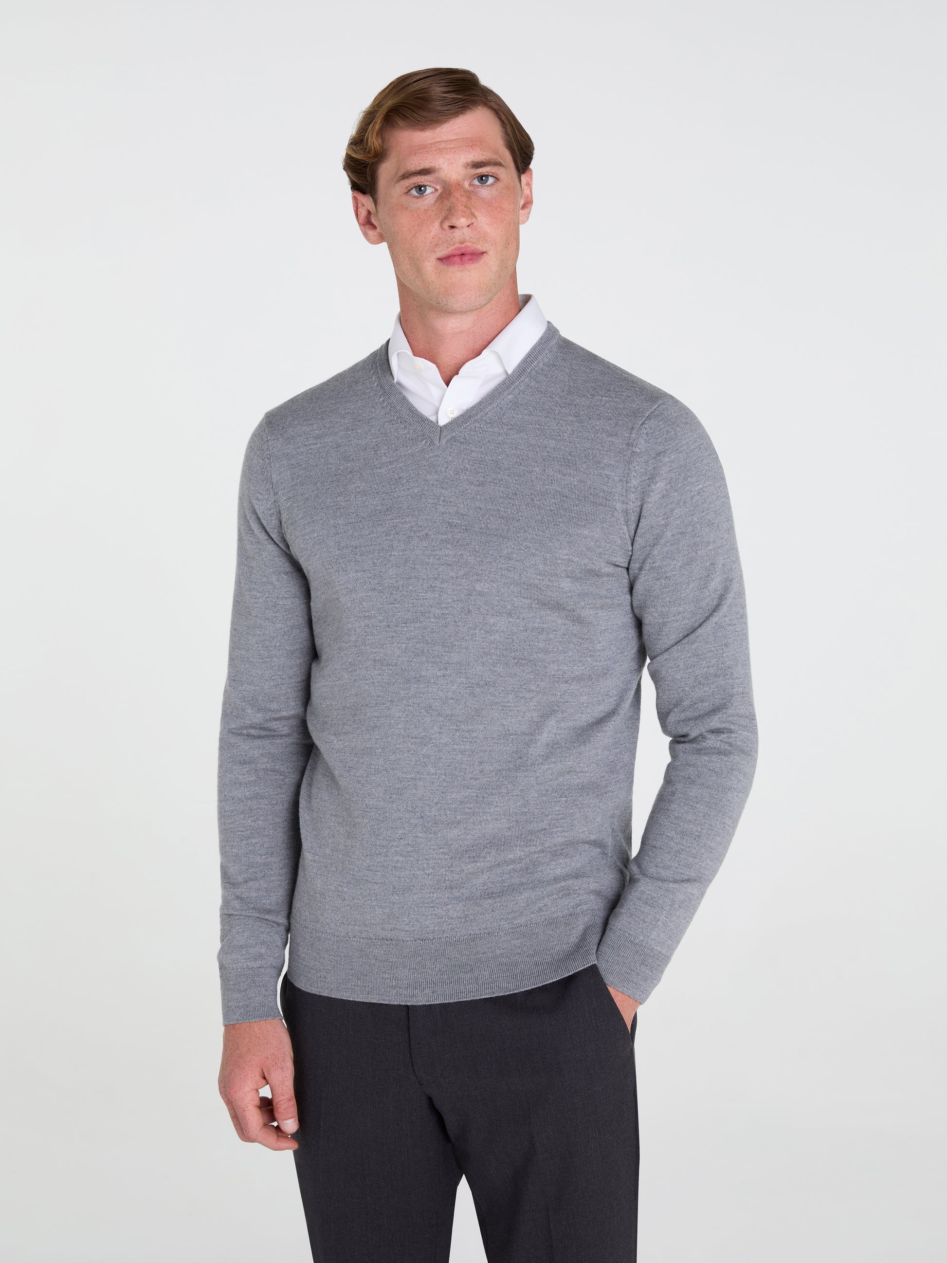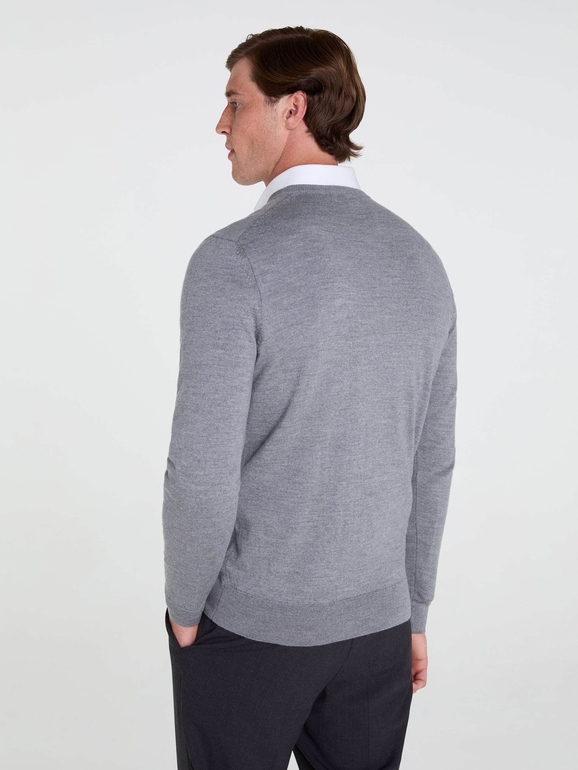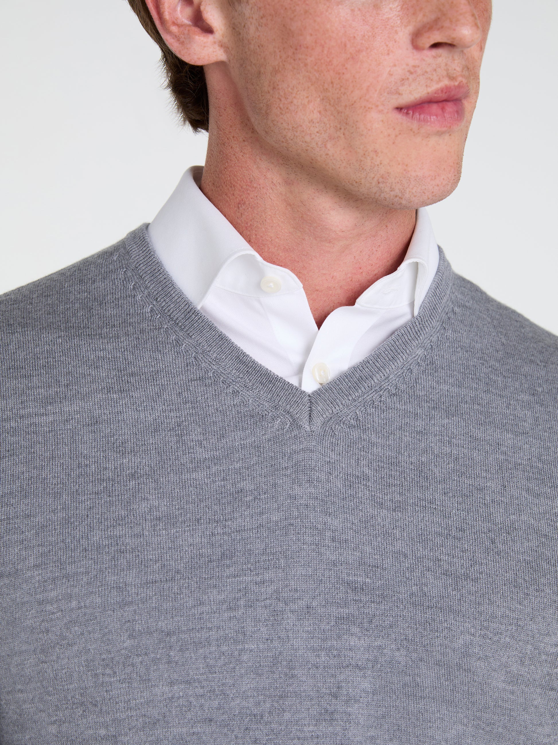 This v-neck jumper is crafted from soft, extra fine merino wool sourced from Italy. Known for its natural performance properties, merino wool wicks away moisture and regulates body temperature, making it ideal for year-round wear.
