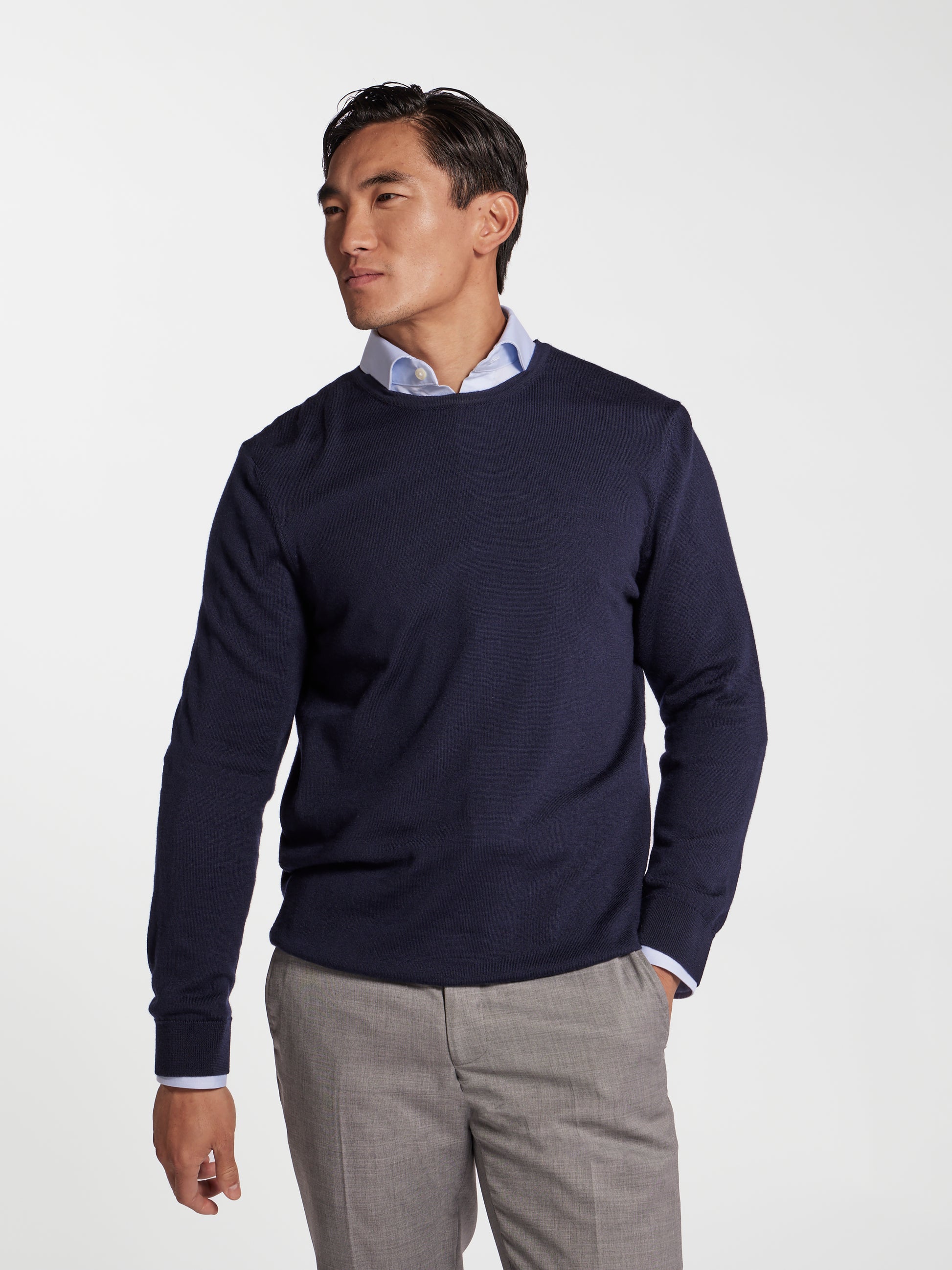 This crew neck jumper is crafted from soft, extra fine merino wool sourced from Italy. Known for its natural performance properties, merino wool wicks away moisture and regulates body temperature, making it ideal for year-round wear.