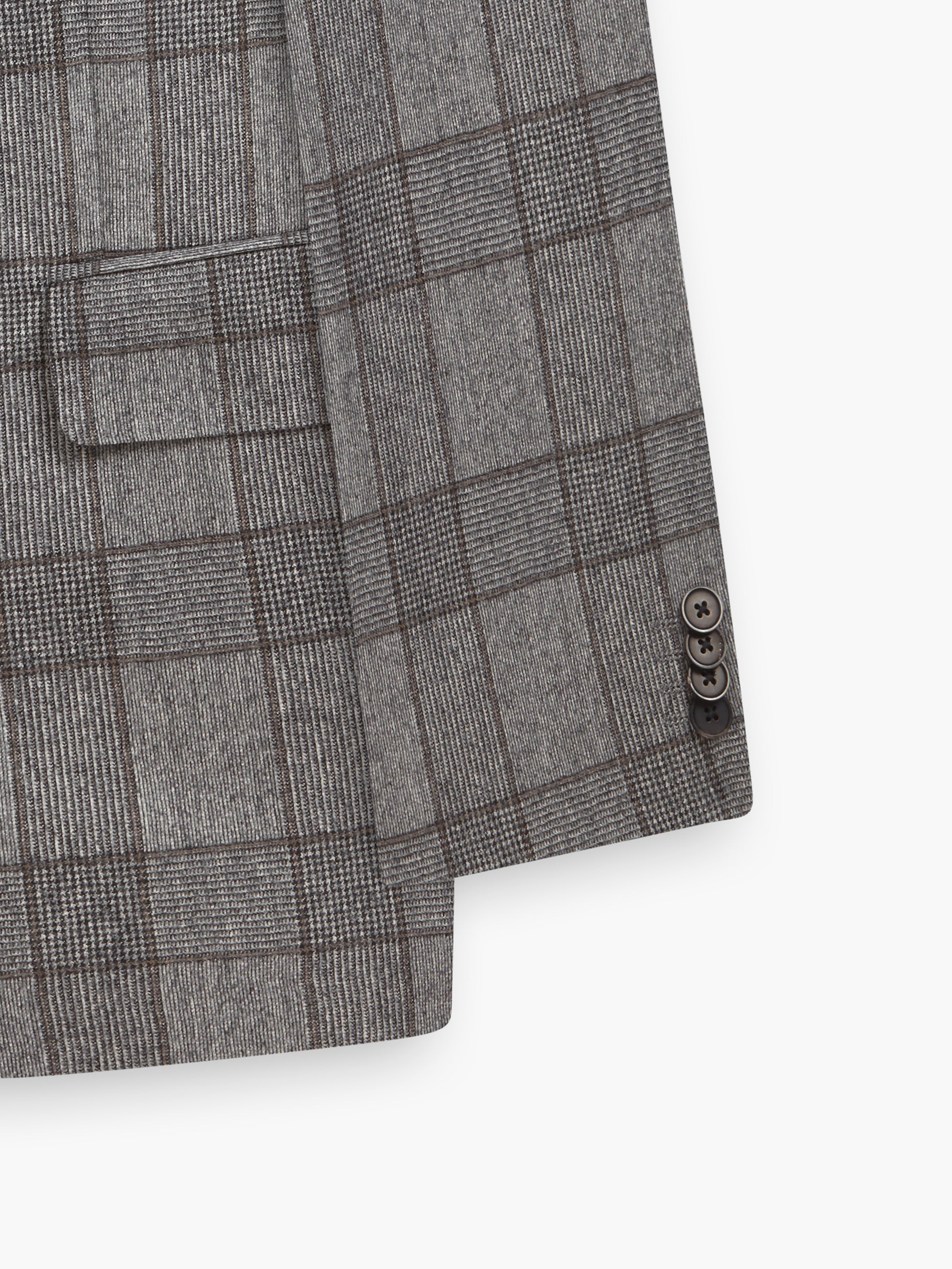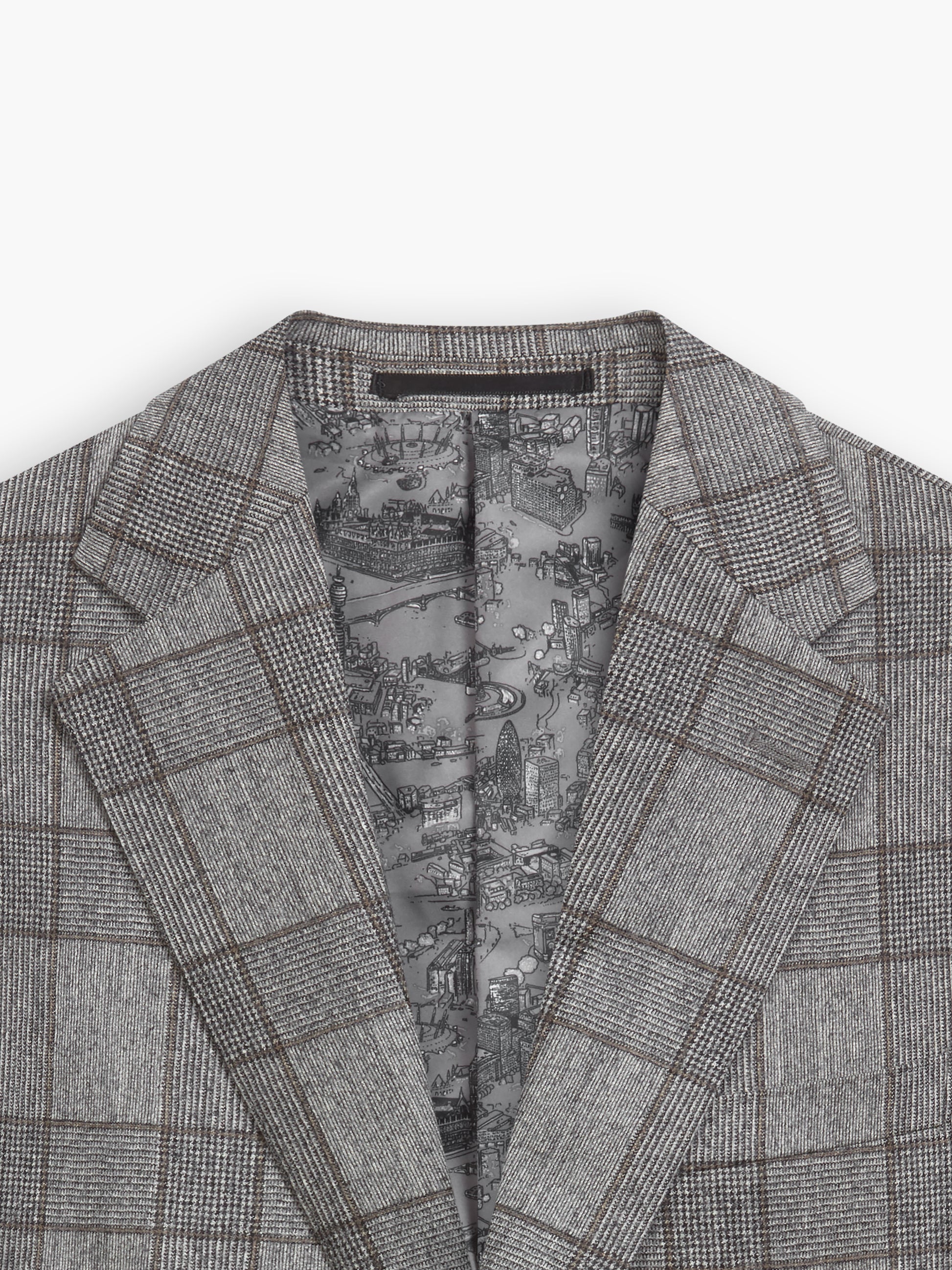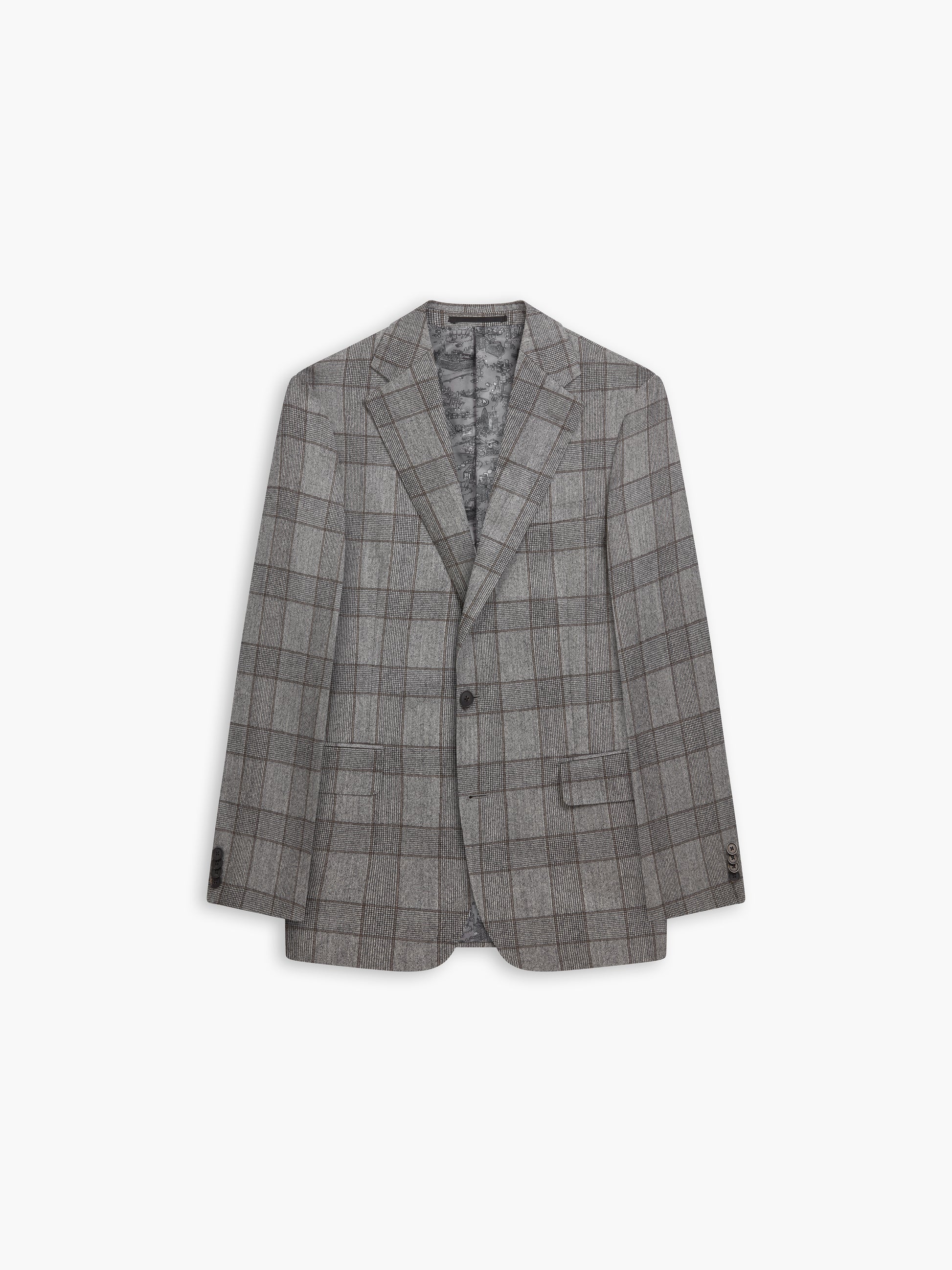 With its bold grey and brown check, this jacket instantly adds an eye-catching twist to ensembles. It is made from pure Merino wool woven in Italy. As well as being durable, it is superbly soft and supple.