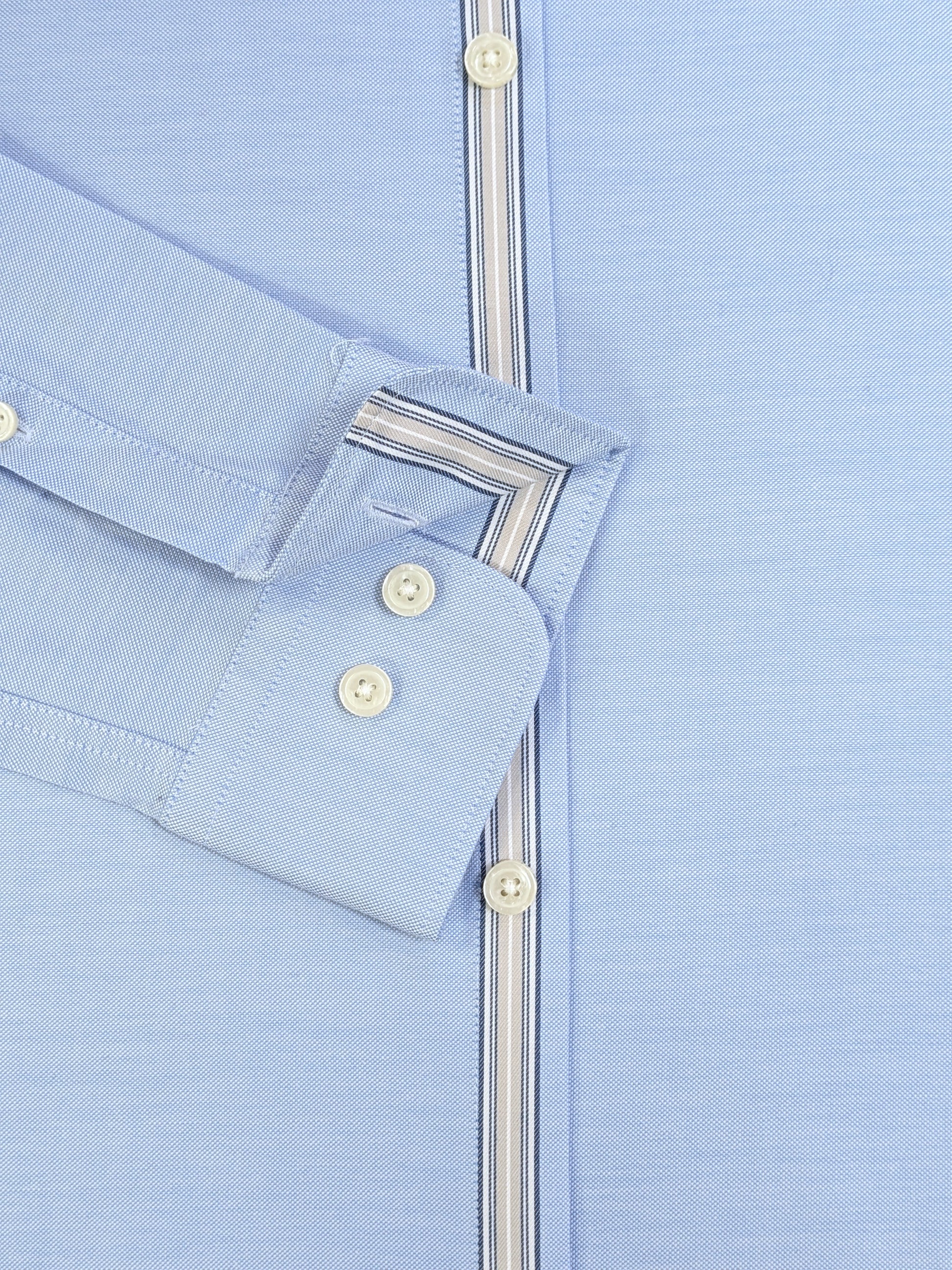 This plain, light blue shirt features eye-catching selvedge stripes on the sleeves and underneath the buttons. Selvedges are typically found on denim, but in this case they are a decorative trim instead.