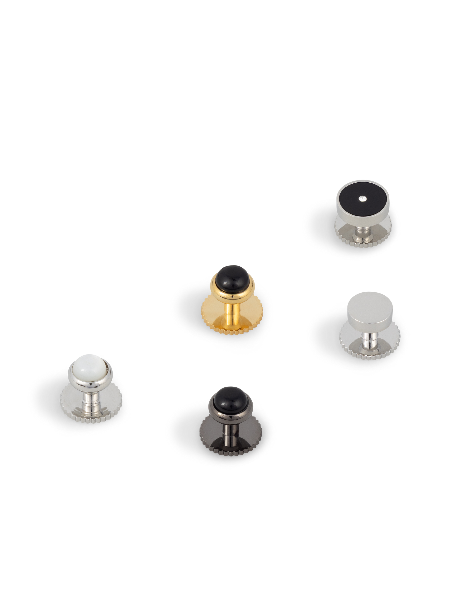 Our dress shirt studs replace traditional buttons as decorative fasteners on our evening dress shirts. 5 studs are offered in each set so you have the option to wear the fifth stud instead of a cummerbund with your black tie outfit.
