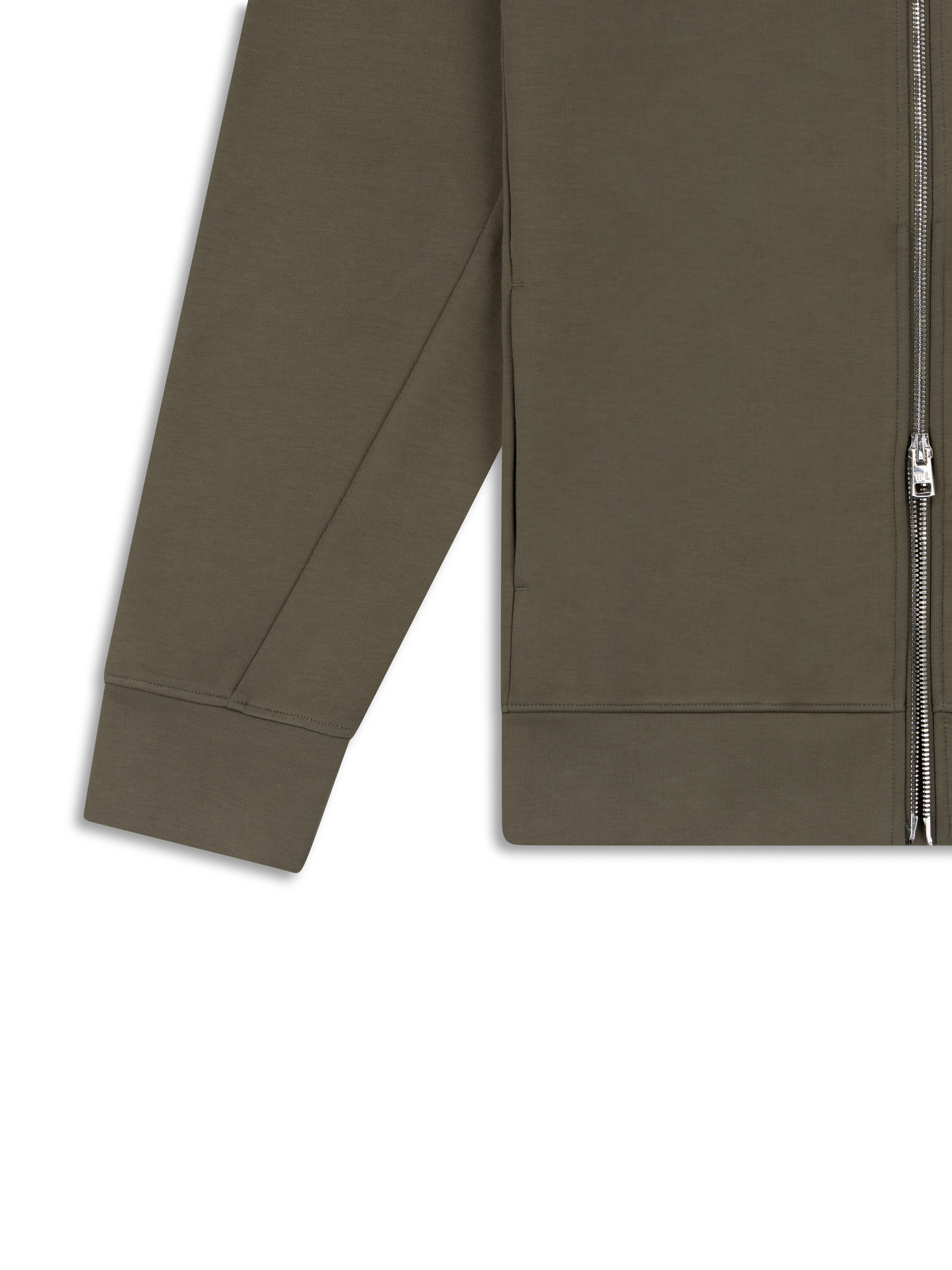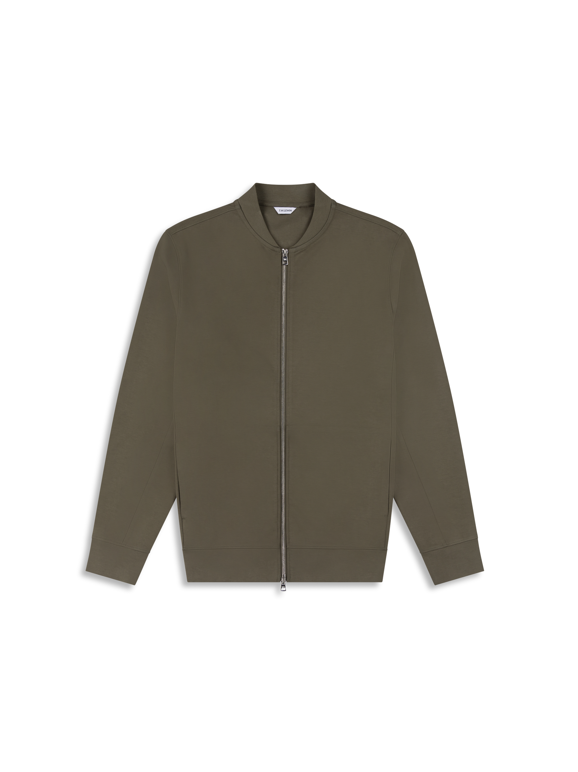 This khaki zip through bomber jacket is crafted from a blend of 78% Global Organic Textile Standard (GOTS) certified organic cotton, 15% polyester and 7% elastane, the fabric gives you a smooth finish with stretch, so you stay comfortable whether you’re heading into the office, travelling, or layering on cooler days.