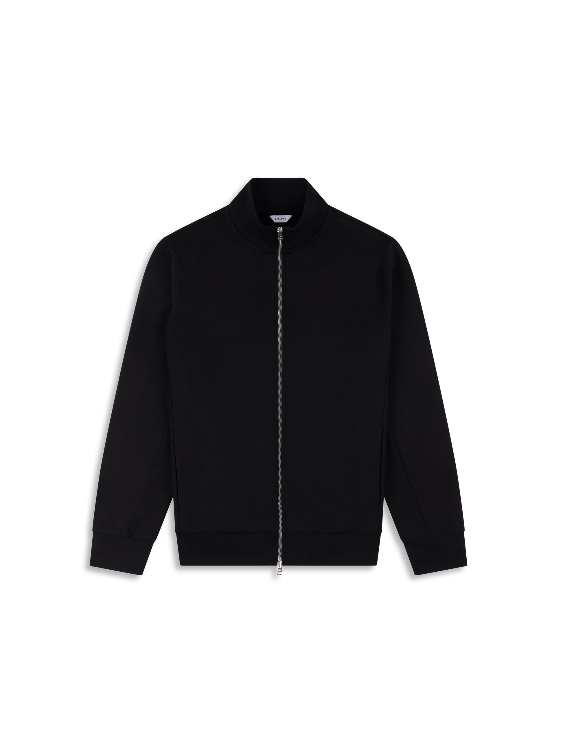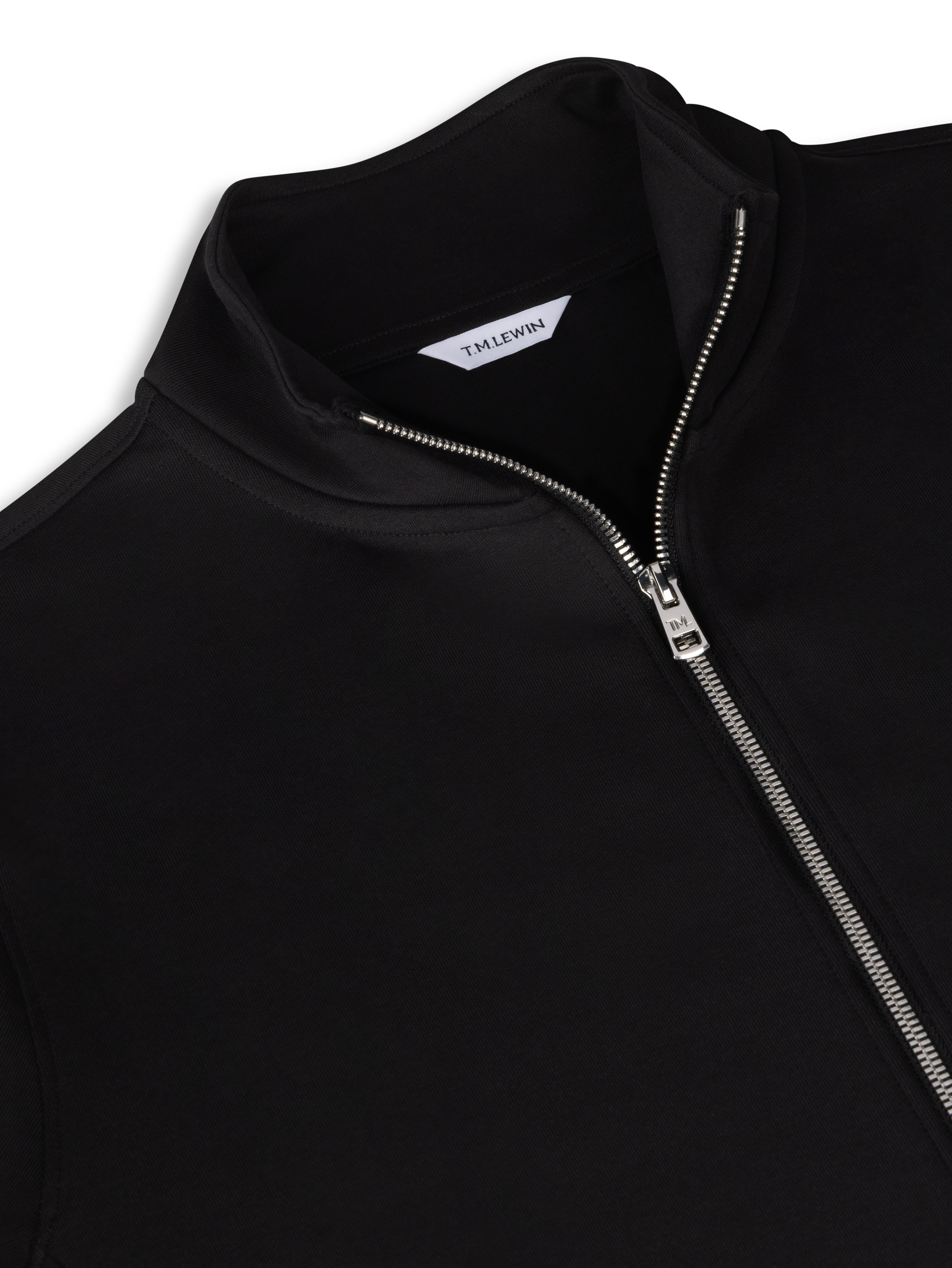 This black funnel neck zip jacket is crafted from a blend of 78% Global Organic Textile Standard (GOTS) certified organic cotton, 15% polyester and 7% elastane, the fabric gives you a smooth finish with stretch, so you stay comfortable whether you’re heading into the office, travelling, or layering on cooler days.