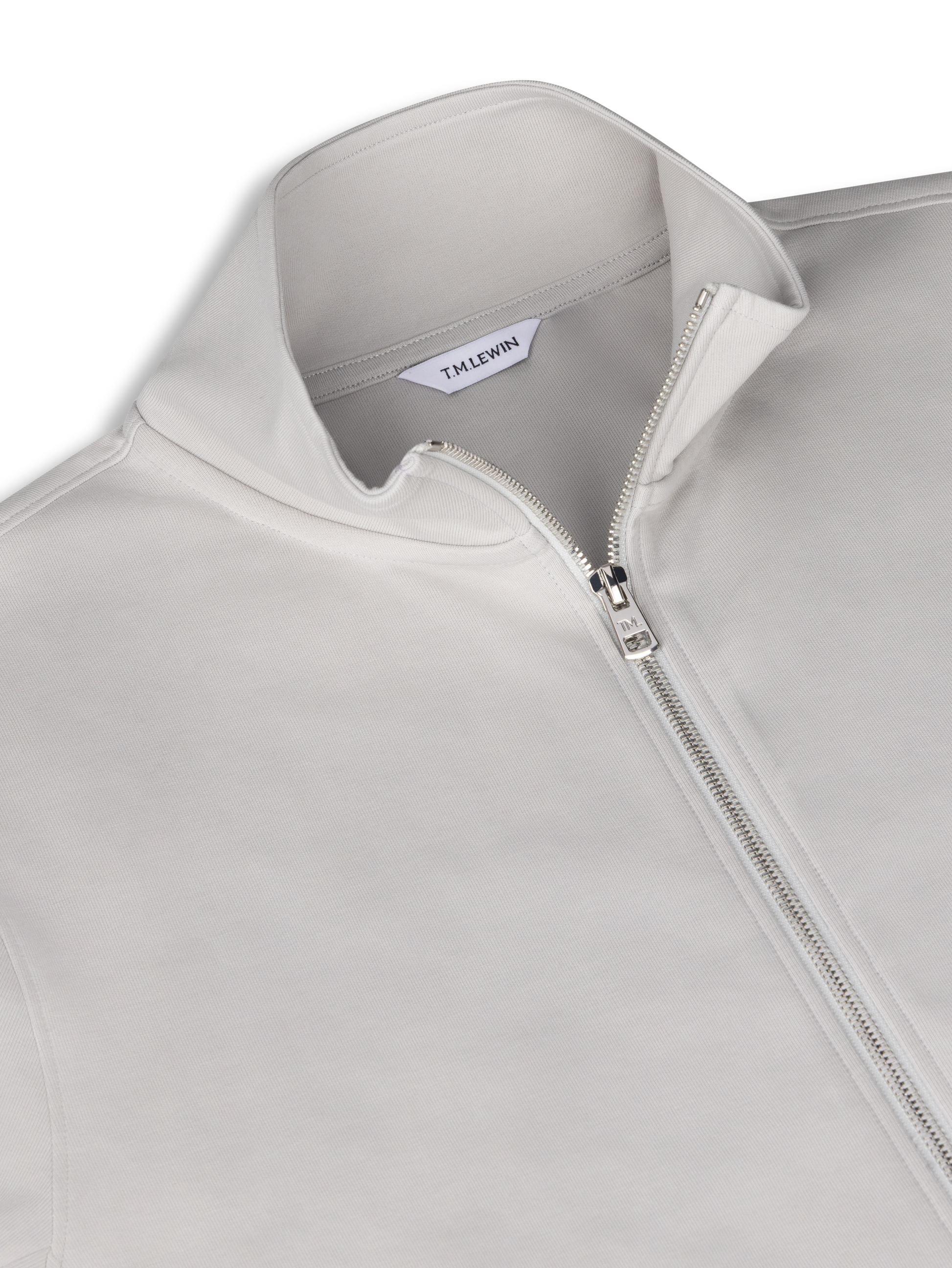 This light grey funnel neck zip jacket is crafted from a blend of 78% Global Organic Textile Standard (GOTS) certified organic cotton, 15% polyester and 7% elastane, the fabric gives you a smooth finish with stretch, so you stay comfortable whether you’re heading into the office, travelling, or layering on cooler days.