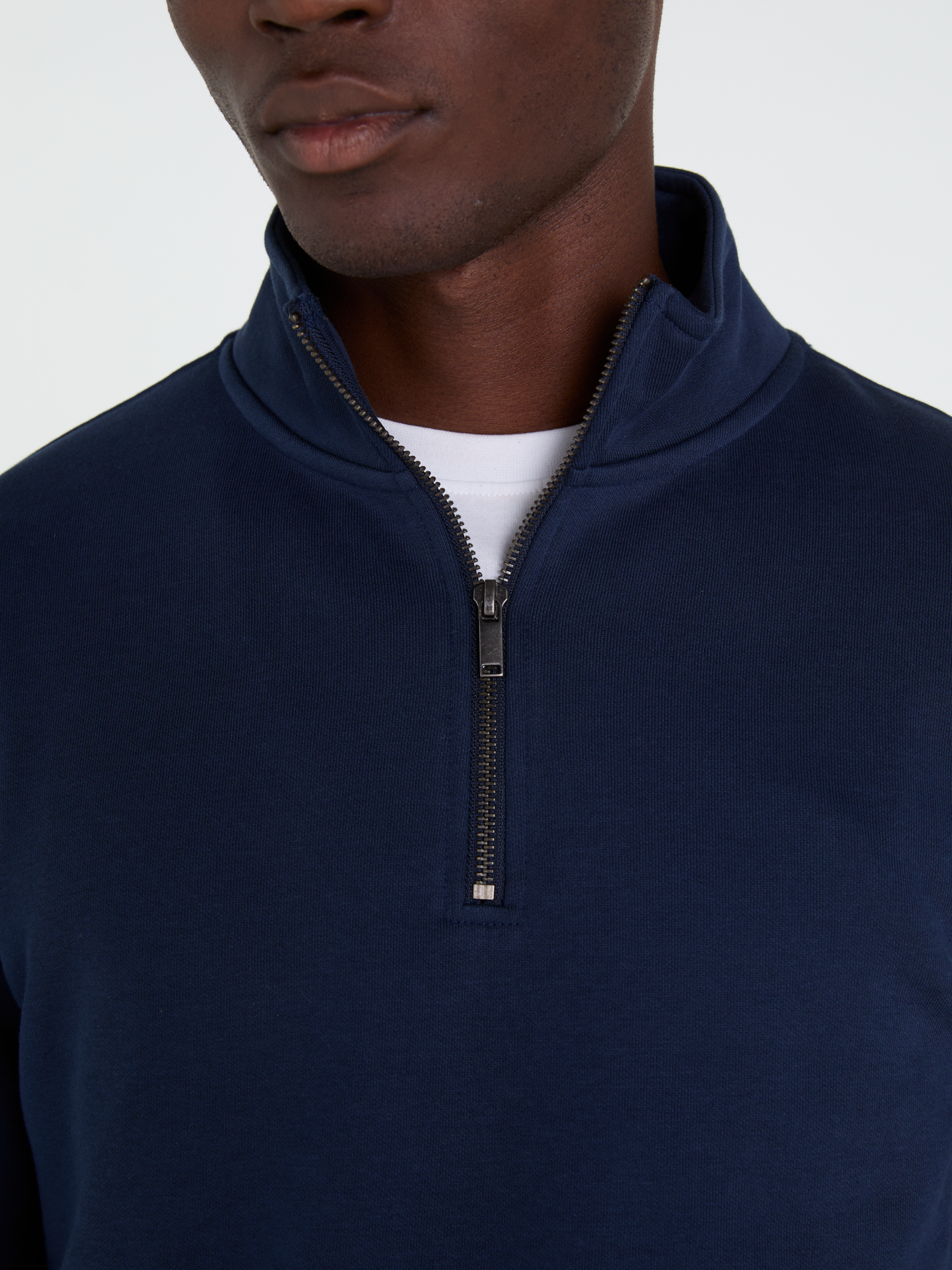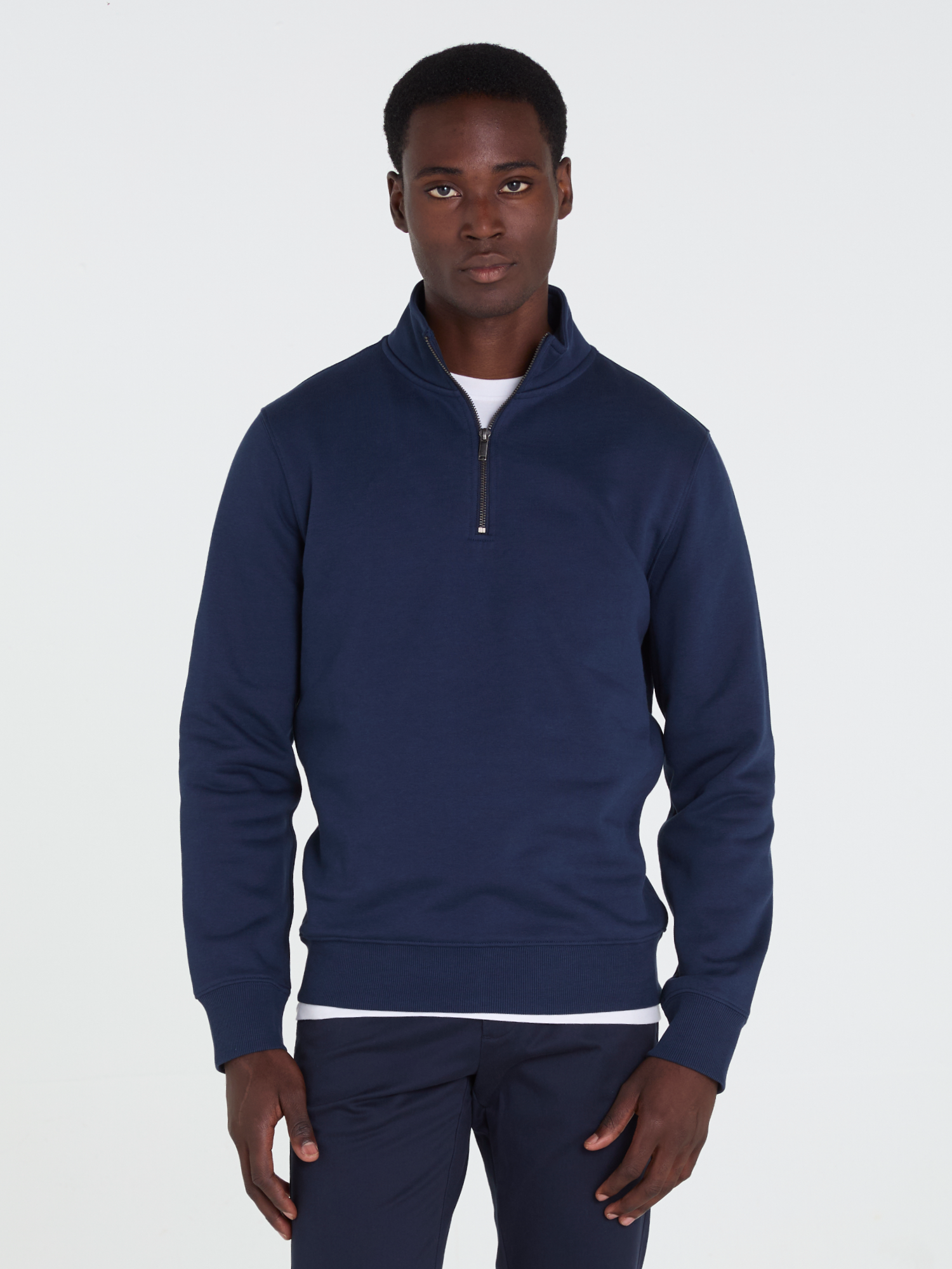 This quarter zip sweatshirt is crafted from a blend of 70% Global Organic Textile Standard (GOTS) certified organic cotton and 30% recycled polyester. The brushback fleece offers a soft, cosy feel with warmth and durability, making it perfect for layering in cooler weather.