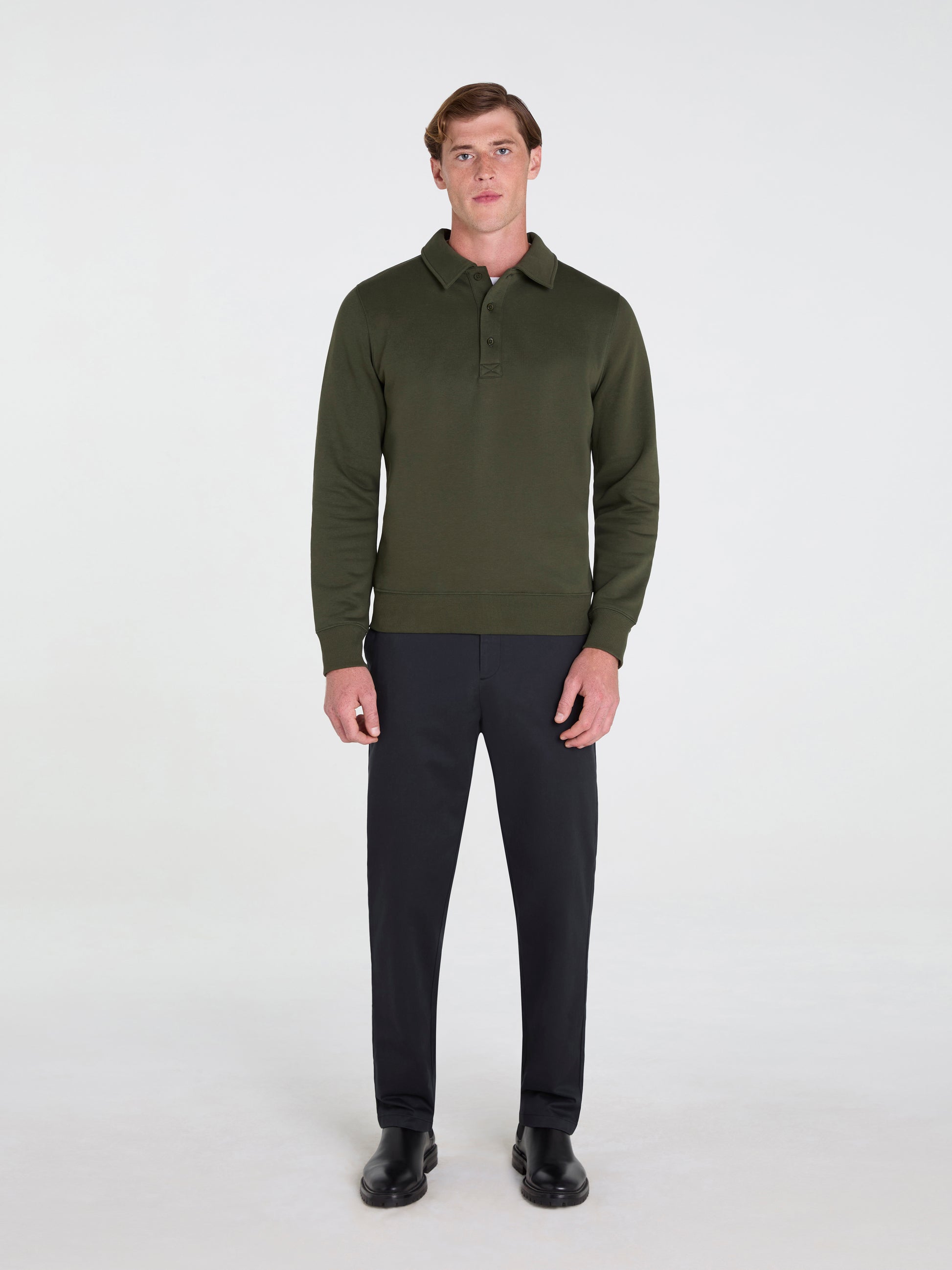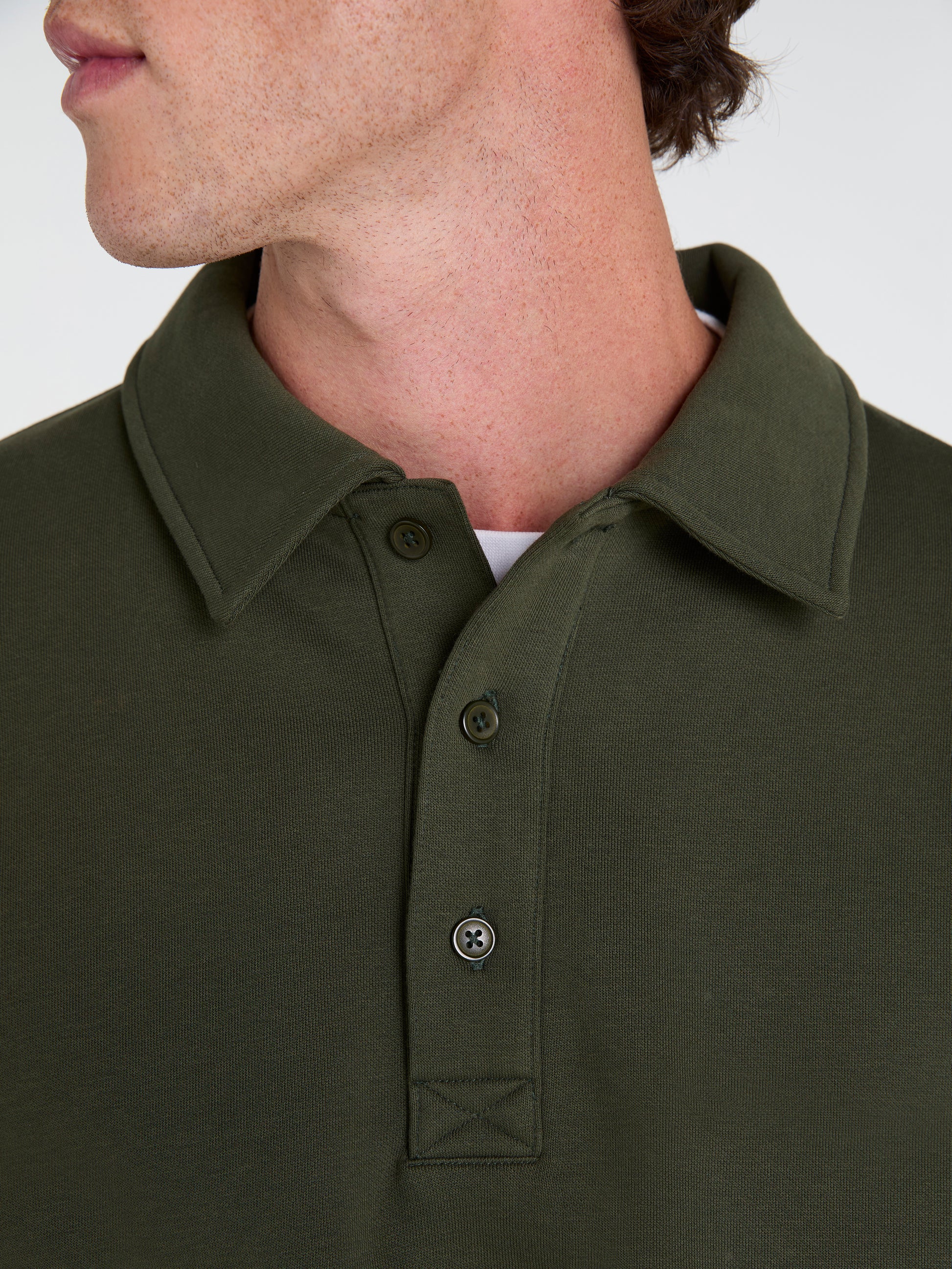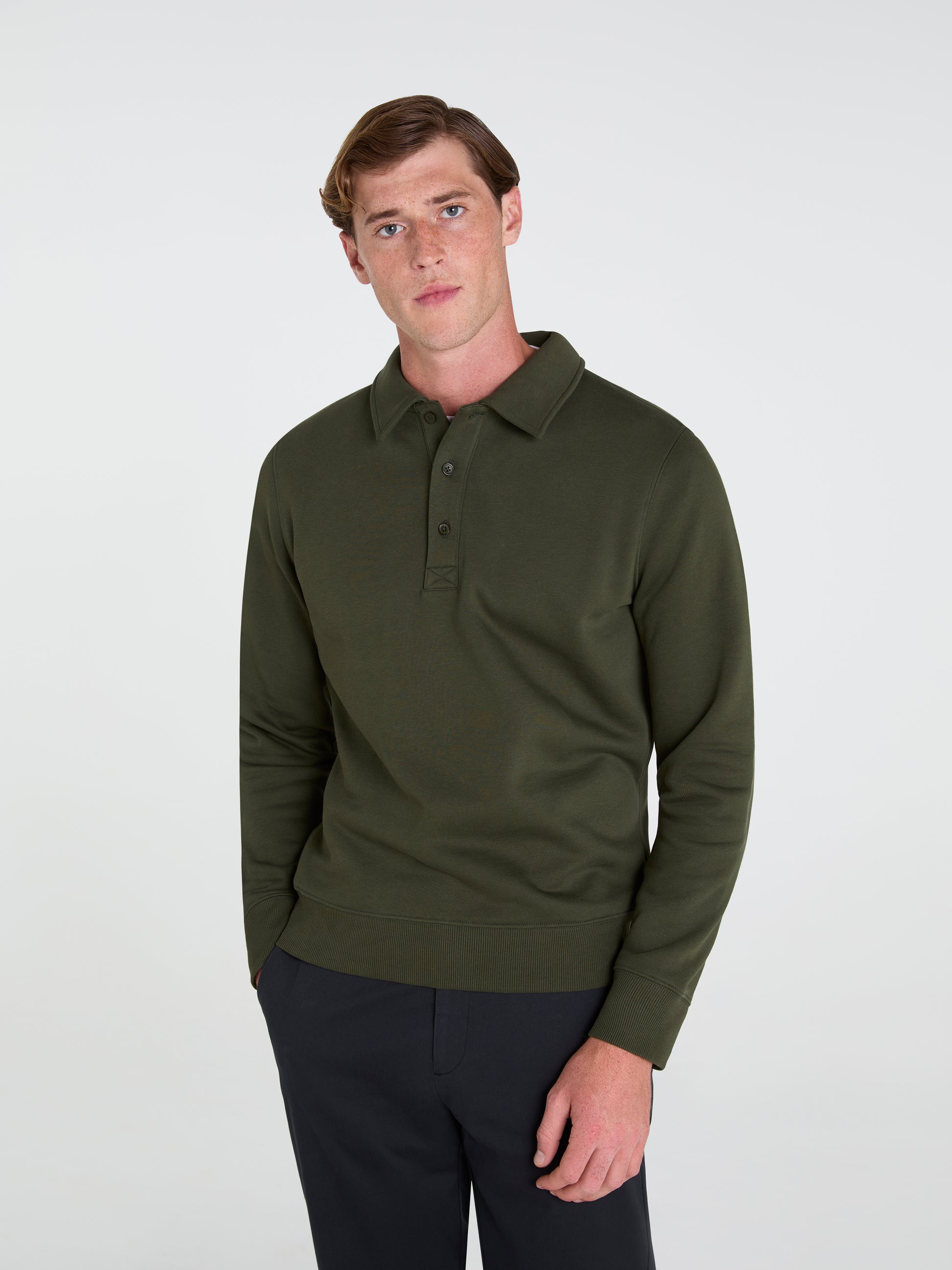 This polo sweatshirt is crafted from a blend of 70% Global Organic Textile Standard (GOTS) certified organic cotton and 30% recycled polyester. The brushback fleece offers a soft, cosy feel with warmth and durability, making it perfect for layering in cooler weather.
